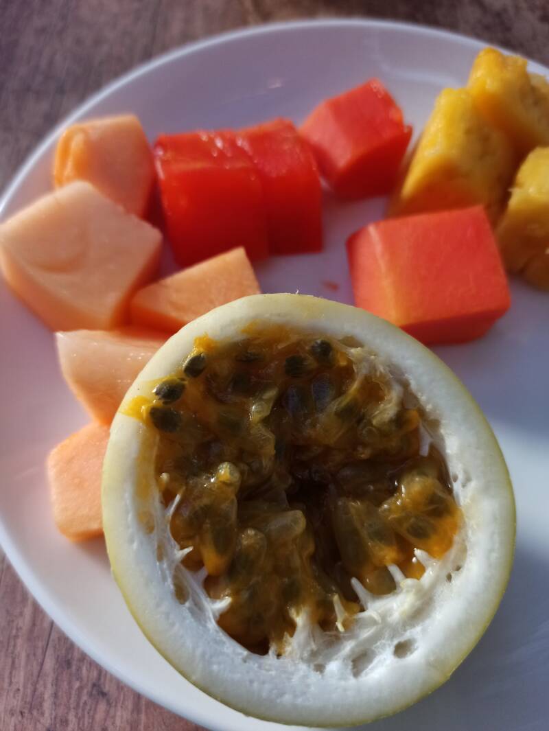 Heimische Früchte zum Frühstück, Passionsfrucht, Melone und Ananas.