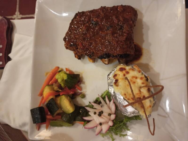Hähnchensteaks bestreut mit einheimischen Kakao-Nips rechts: Casado - Nationalgericht in Costa Rica