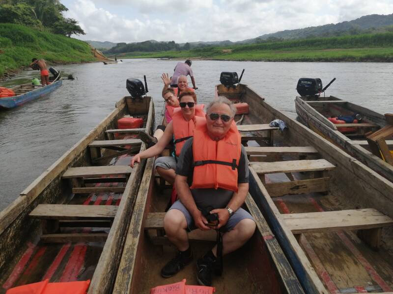 Am ersten Tag unseres Aufenthalts stand ein Besuch bei den Emberados, einem Indianervolk, das im Urwald in der Nähe von Panama City lebt, auf dem Plan. Begleitet wurden wir durch Elisabeth, unserer deutschsprachigen Reisebegleitung. Schon gegen neun Uhr bestiegen wir das Einboot um ca. 25 km flussaufwärts zu fahren. Die Anreise war beschwerlich. Immer wieder mussten die Bootsführer ins Wasser, um uns durch viel zu seichtes Fahrwasser zu manövrieren. Die Fahrt führte durch den Urwald, wo wir exotische Vögel, Pflanzen und Bäume bestaunen konnten und sogar Kaimane beim Sonnen gestört haben.