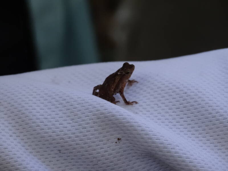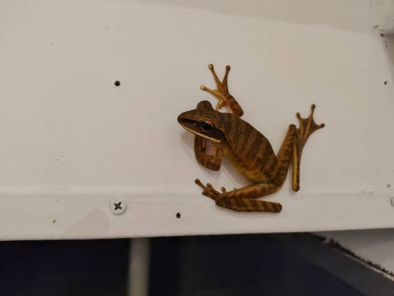 Schmetterling und Frosch, die sich auf das Schiff verirrt haben. Was auch nicht verwundert, denn feste Anlegestellen gibt es nicht. Das Schiff fährt in den Urwald und wird an einem starken Baum festgebunden. So war aus unserer Kabine heraus der Wald so manches Mal zum Greifen nah.