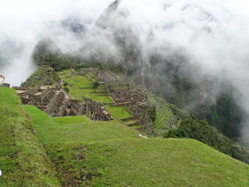 Die Lamas halten das Gras auf dem heiligen Platz kurz. Wir besuchten Machu Picchu zum Ende der Regenzeit. Alles ist grün und die Blumen blühen. Einige Monate später wird der Berg trocken und das Gras verbrannt sein.