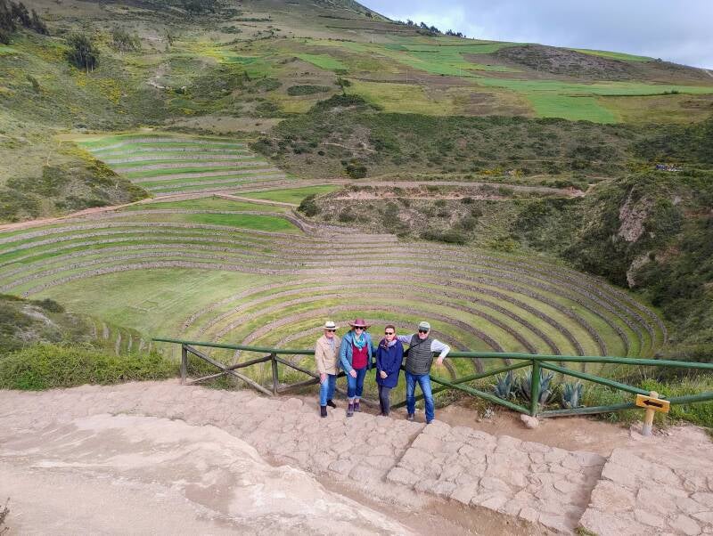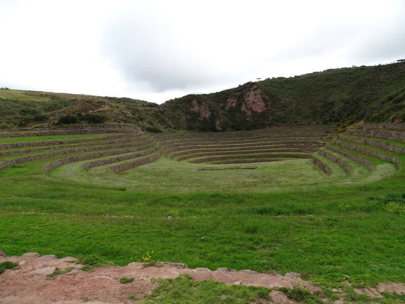 Unser erstes Ziel sind die Terrassen von Moray auf 3.476 m Höhe. Als man sie entdeckte, dachte man noch, es handelt sich um ein Amphietheater. Archäologische Untersuchungen aber zeigten, dass die Inka hier ein Laboratorium zur Erforschung von Feldfrüchten betrieben. Die auf unterschiedlichen Höhen liegenden Terrassen sind in verschiedenem Maße Sonneneinstrahlung und Schatten ausgesetzt. Der Temperaturunterschied von unten nach oben beträgt etwa 10 Grad Celsius. Die heutigen Untersuchungen brachten Spuren von ca. 250 verschiedenen Getreide- und Gemüsesorten zu Tage.
