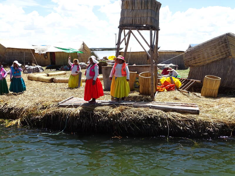 Besuch auf einer von 180 schwimmenden Schilfinseln. Die Inseln werden von den Urus bewohnt, die dort seit jeher ihre Bräuche und Traditionen pflegen. Auf jeder Insel leben etwa vier Familien, ca. 25 Menschen. Die Inseln, wie auch die Häuser darauf sind aus Schilf erbaut. Ihren Lebensunterhalt verdienen sich die Menschen u.a. mit dem Verkauf von kunstvoll gefertigten Handarbeiten.