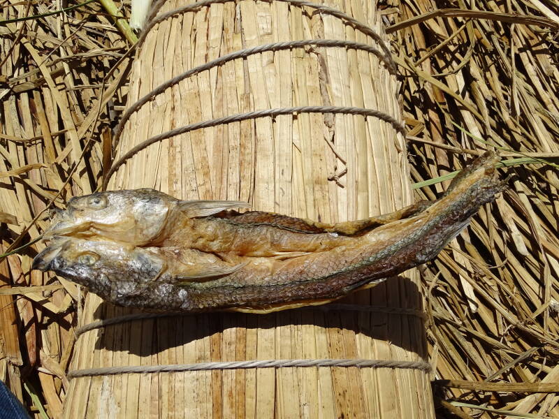 unten: übliche Nahrungsmittel, fangfrischer Fisch, in der Sonne getrockneter Fisch und Blesshuhn, Eier von Wasservögeln